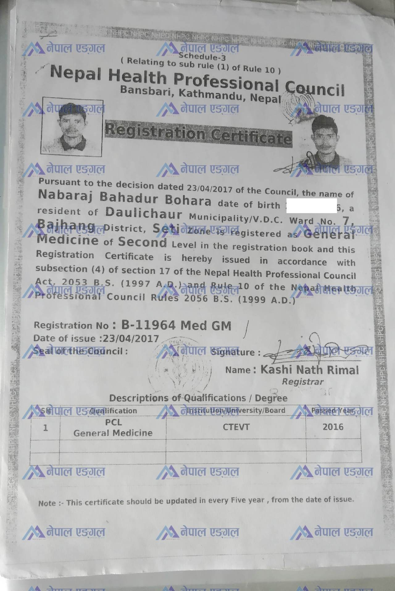 हामीलाई स्रोतबाट प्राप्त सूचना अनुसार प्रशासन वा अन्य निकायबाट चेकजाँच गर्दा चैन मेडिकल सञ्चालकले एक व्यक्तिको सर्टिफिकेट देखाउँदै आएका छन् । सुर्मा गाउँपालिका स्थायी ठेगाना भएका नवराज बोहराको सर्टिफिकेट देखाएर सरोकारवाला पदाधिकारीलाई झुक्क्याउँदै आएको स्रोतको दाबी छ । बोहराले सामान्य चिकित्सा अध्ययन गरेको उनको सर्टिफिकेटमा देखिन्छ । तर, बुधवार बोहरा मेडिकलमा थिएनन् ।