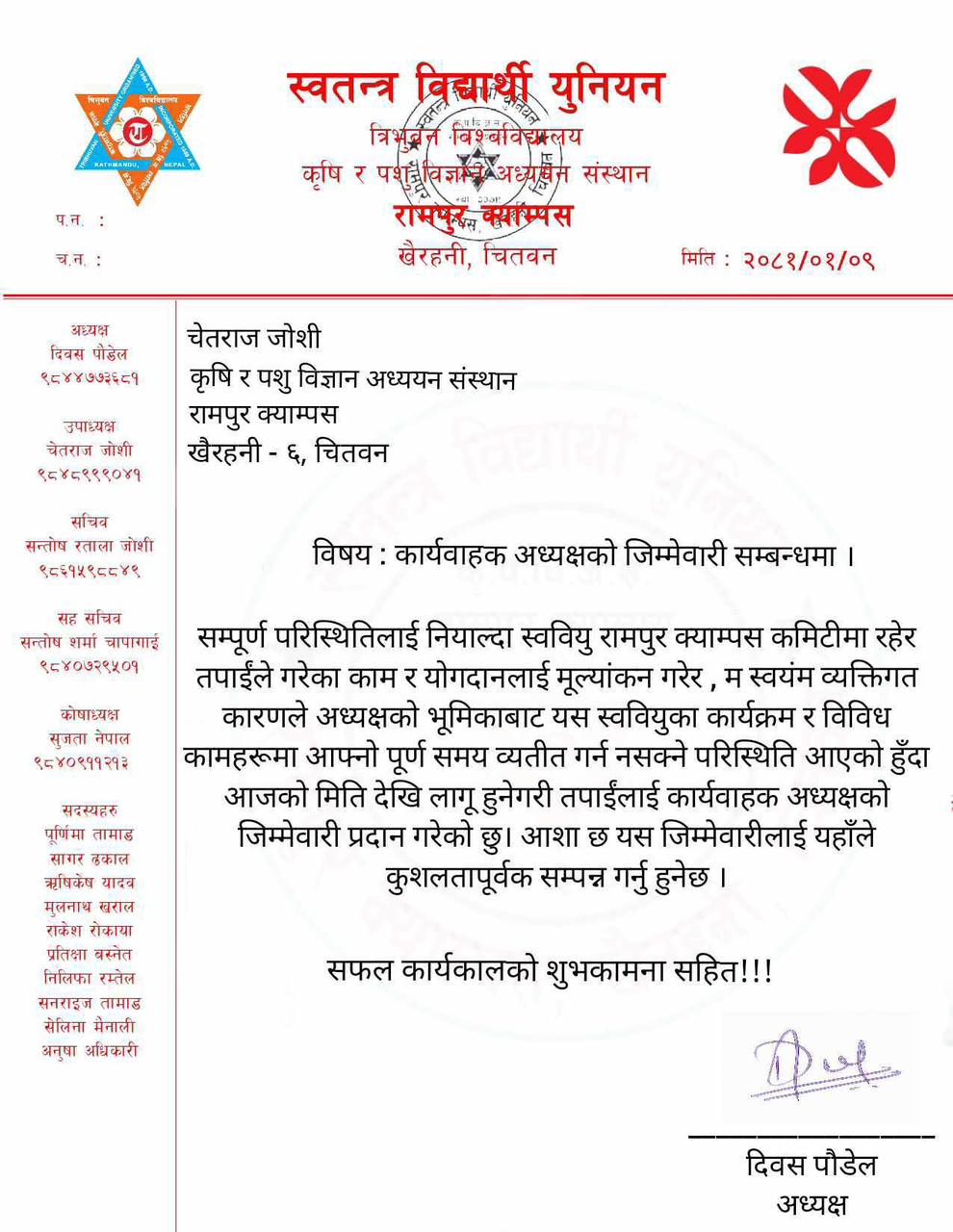 चितवनको कृषि र पशु अध्ययन संस्थान रामपुर क्याम्पसको स्वतन्त्र विद्यार्थी युनियन सभापतिको जिम्मेवारी चेतराज जोशीले सम्हाल्ने भएका छन् । निर्वाचित अध्यक्ष दिवस पौडेलले व्यक्तिगत कारण देखाउँदै निर्वाचित स्ववियु उपाध्यक्ष चेतराज जोशीलाई कार्य बाहक अध्यक्ष दिएका हुन् । गत वर्षको स्ववियु निर्वाचनमा पौडेल अध्यक्षमा निर्वाचित भएका थिए भने जोशी उपाध्यक्षमा निर्वाचित भएका थिए ।