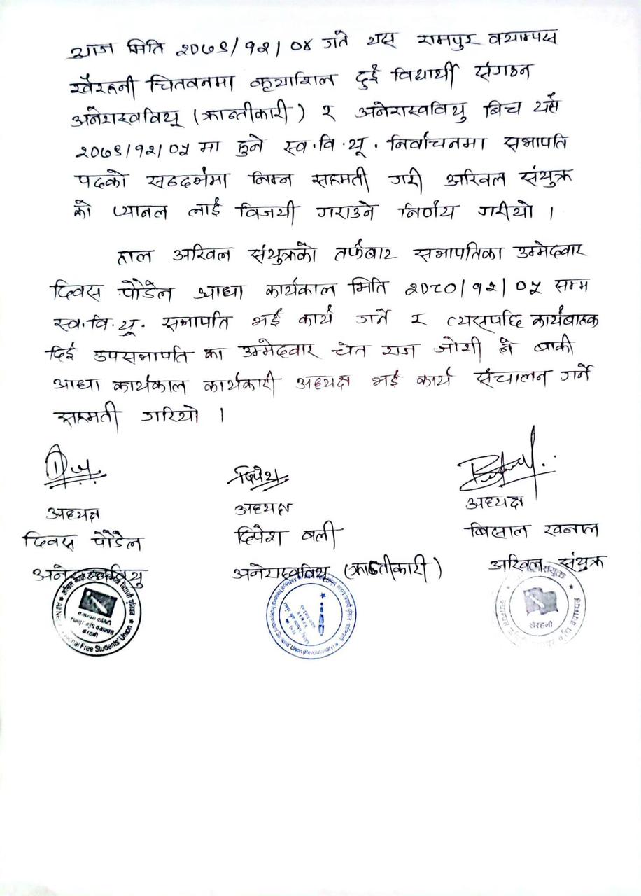 पौडेल र जोशीबिच अध्यक्षको जिम्मेवारी बाँडफाँड गर्ने बारेमा सहमति भएको पत्र समेत सार्वजनिक भएको छ । जसमा भनिएको छ, ‘हाल अखिल संयुक्तको तर्फबाट सभापतिका उम्मेदवार दिवस पौडेल आधा कार्यकाल २०८० चैत्र ५ सम्म स्ववियू सभापति भई कार्य गर्ने र त्यसपछि कार्यवाहक दिई उपसभापतिका उम्मेदवार चेतराज जोशीले वाकी आधा कार्यकाल कार्यकारी अध्यक्ष भई कार्य सञ्चालन गर्ने सहमति गरियो ।
