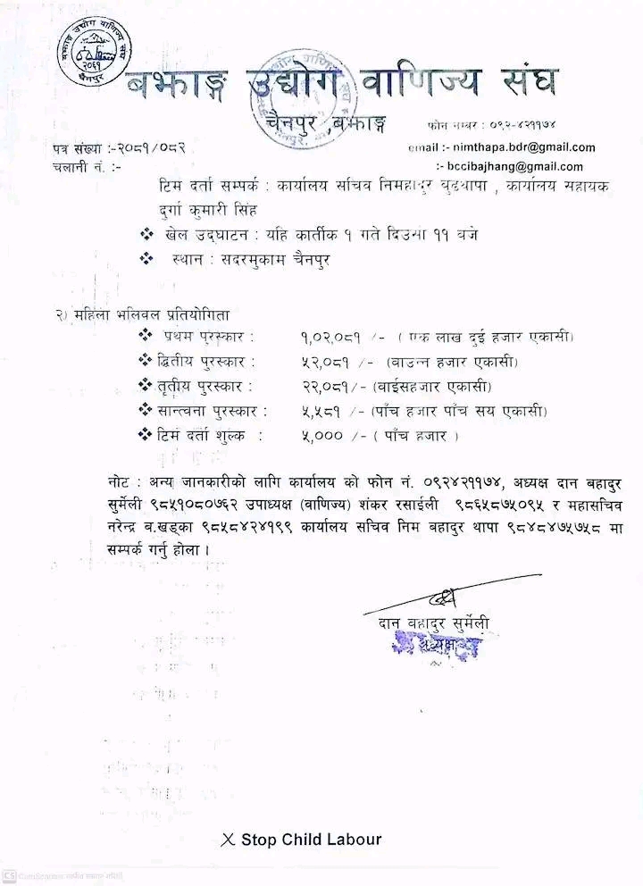 बझाङ उद्योग वाणिज्य सङ्घले भलिबल प्रतियोगिताको आयोजना गरेको छ । महान् चाड वडा दसैँ तथा दिपावलीको अवसर पारि चौथो (बझाङ उद्योग वाणिज्य सङ्घ कप ) २०८१ को आयोजना गरेको हो । खेल उद्घाटन कार्त्तिक १ गते बिहान ११ बजे देखी जिल्ला सदरमुकाम चैनपुरमा हुने बझाङ उद्योग वाणिज्य सङ्घले जानकारी दिएको छ ।