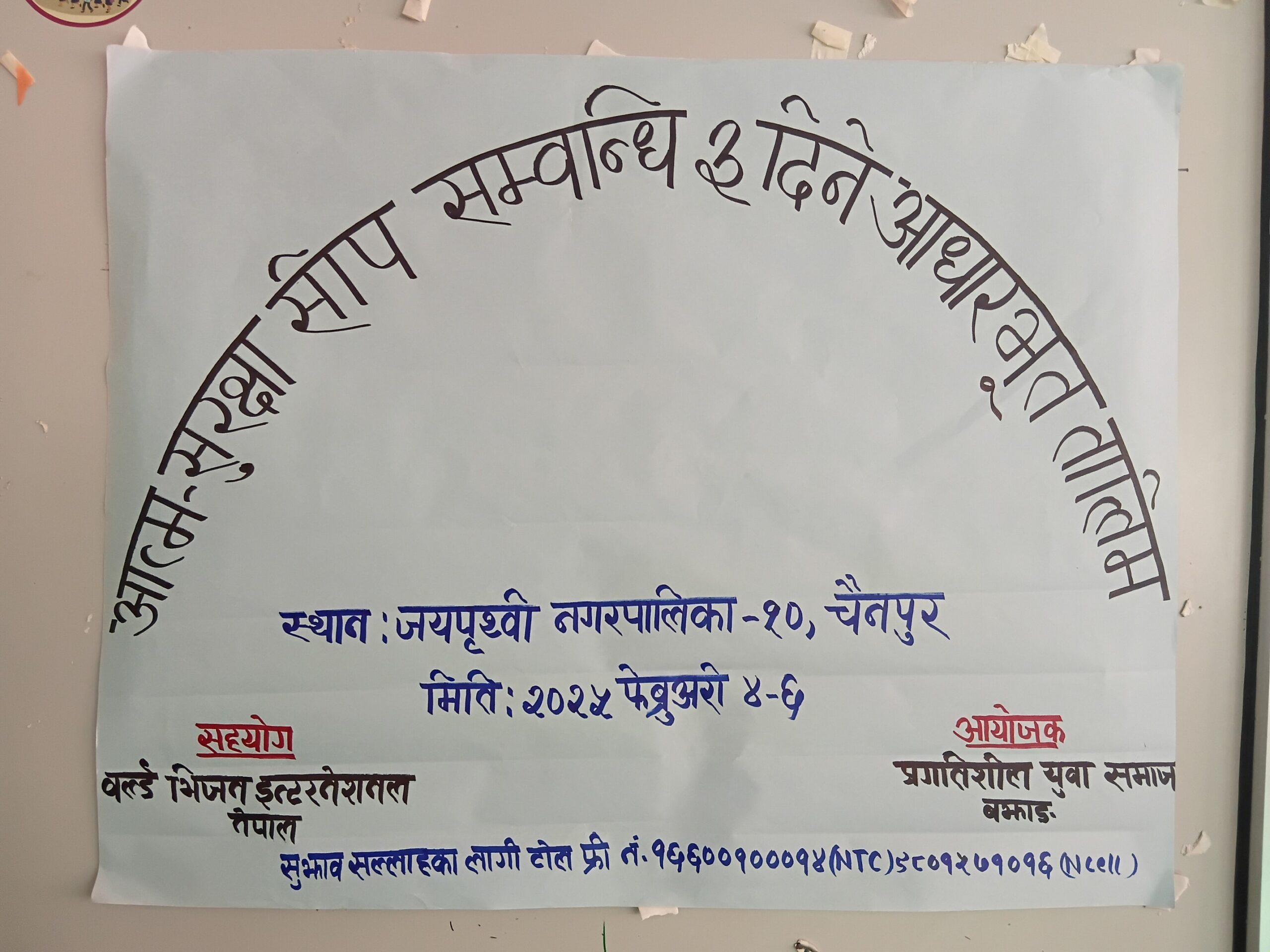 जयपृथ्वी नगरपालिका-१० चैनपुरमा तीन दिने आधारभूत आत्मरक्षा तालिम सम्पन्न भएको छ । प्रगतिशील युवा समाजको आयोजनामा तथा वर्ल्ड भिजन इन्टरनेशनल नेपालको सहयोगमा सञ्चालन भएको उक्त तालिममा जयपृथ्वी नगरपालिका र केदारस्युँ गाउँपालिकाका सहभागी साथी शिक्षकलाई आत्मरक्षा सम्बन्धी सीप प्रदान गरिएको थियो ।