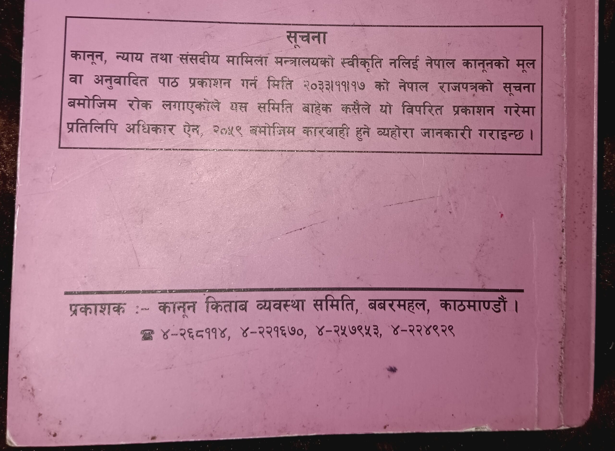 कानून किताब व्यवस्था समितिले प्रकाशन गरेका किताबहरु प्रकाशन गर्नु परेमा कानून मन्त्रालयको पूर्व स्वीकृति लिनुपर्ने व्यवस्था छ । तर, केही नीजी प्रकाशन कम्पनीले भने कानून मन्त्रालयकै आँखा छलेर कानून विपरीत काम गरिरहेका छन् ।