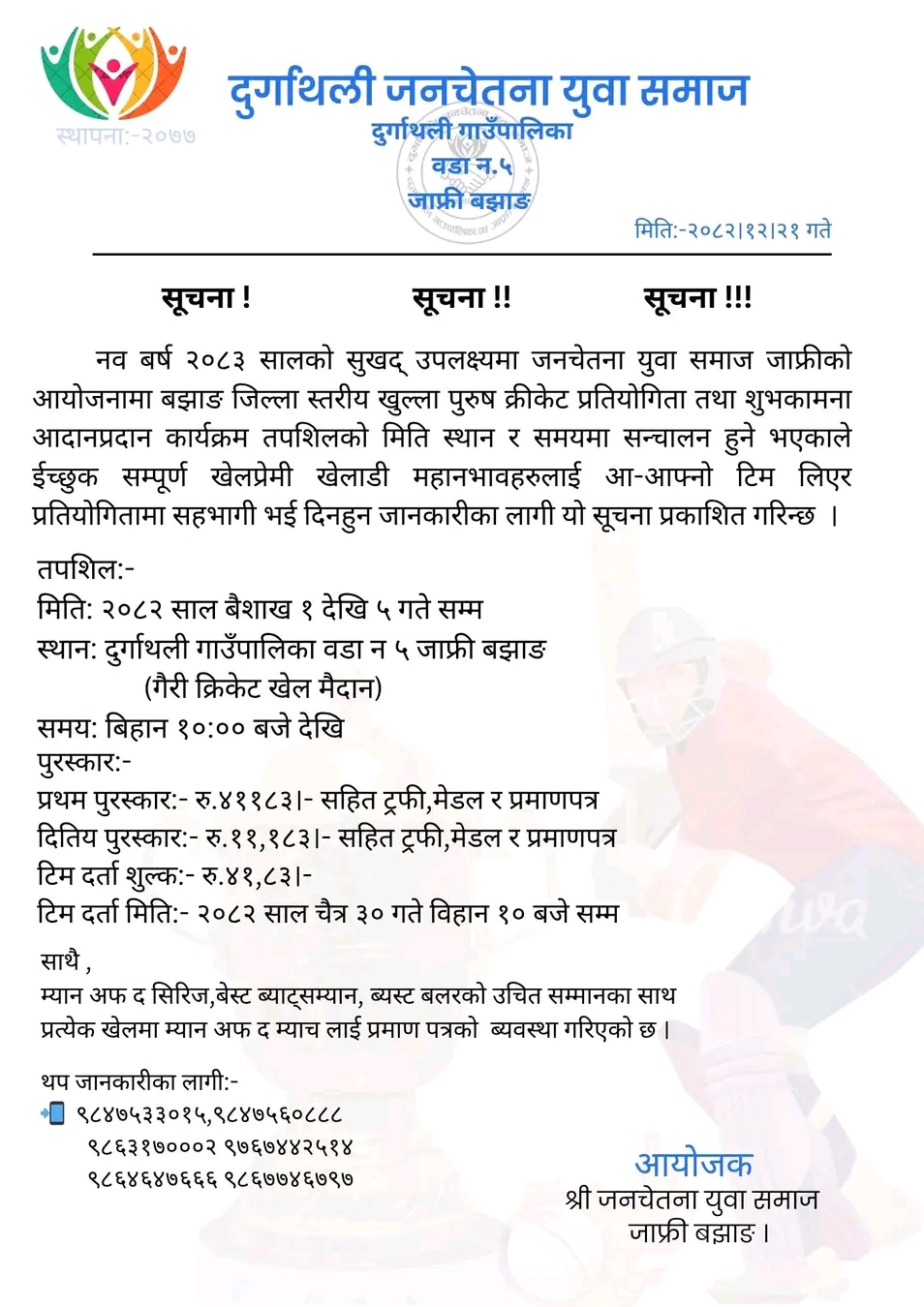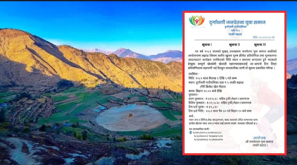 बझाङ : नयाँ वर्ष २०८३ सालको अवसर पारेर बझाङको दुर्गाथली गाउँपालिका–५ जाफ्रीमा जिल्ला स्तरीय खुल्ला पुरुष क्रिकेट प्रतियोगिता आयोजना गरिएको छ । जनचेतना युवा समाज जाफ्री बझाङको आयोजनामा प्रतियोगिता सञ्चालन हुन लागेको हो ।