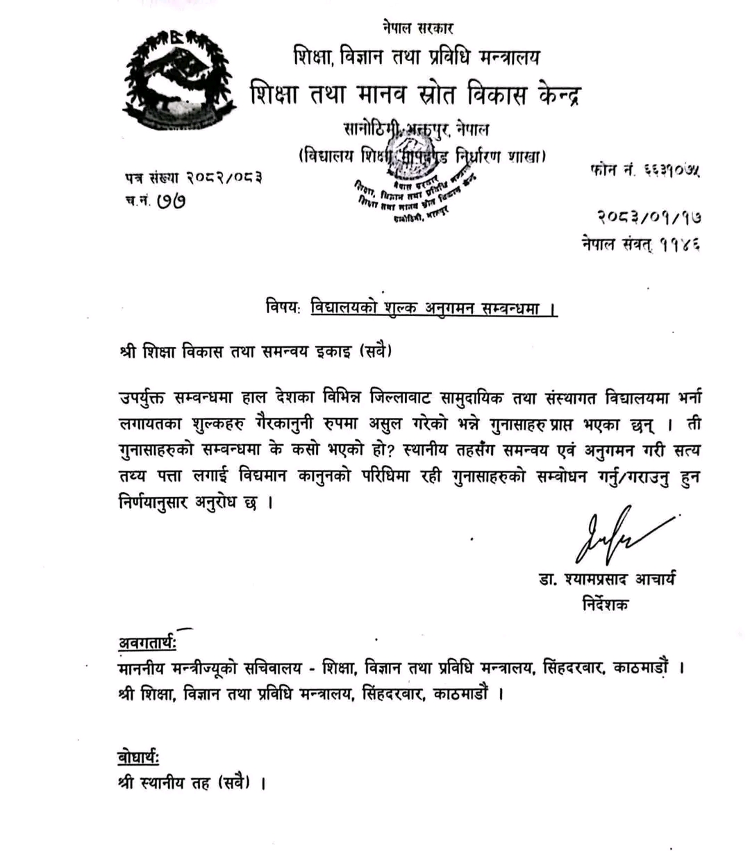 केन्द्रले जारी गरेको पत्रमा विद्यालयहरूले कानुन विपरीत शुल्क लिएको सम्बन्धमा विभिन्न जिल्लाबाट गुनासो आएको उल्लेख गर्दै स्थानीय तहसँग समन्वय गरी सत्यतथ्य बुझ्न र प्रचलित कानुनको परिधिभित्र रही समस्या समाधान गर्न आग्रह गरिएको छ ।